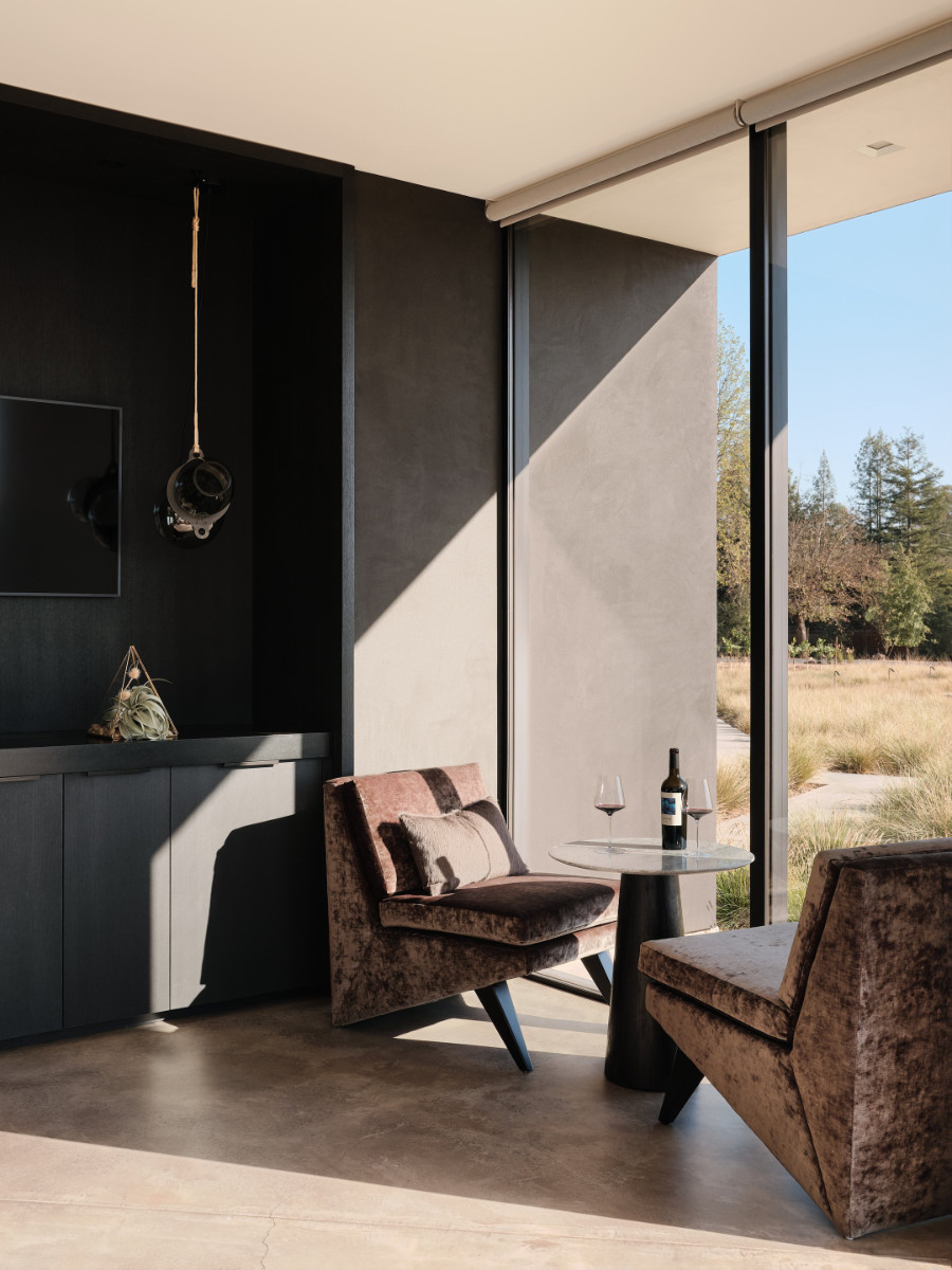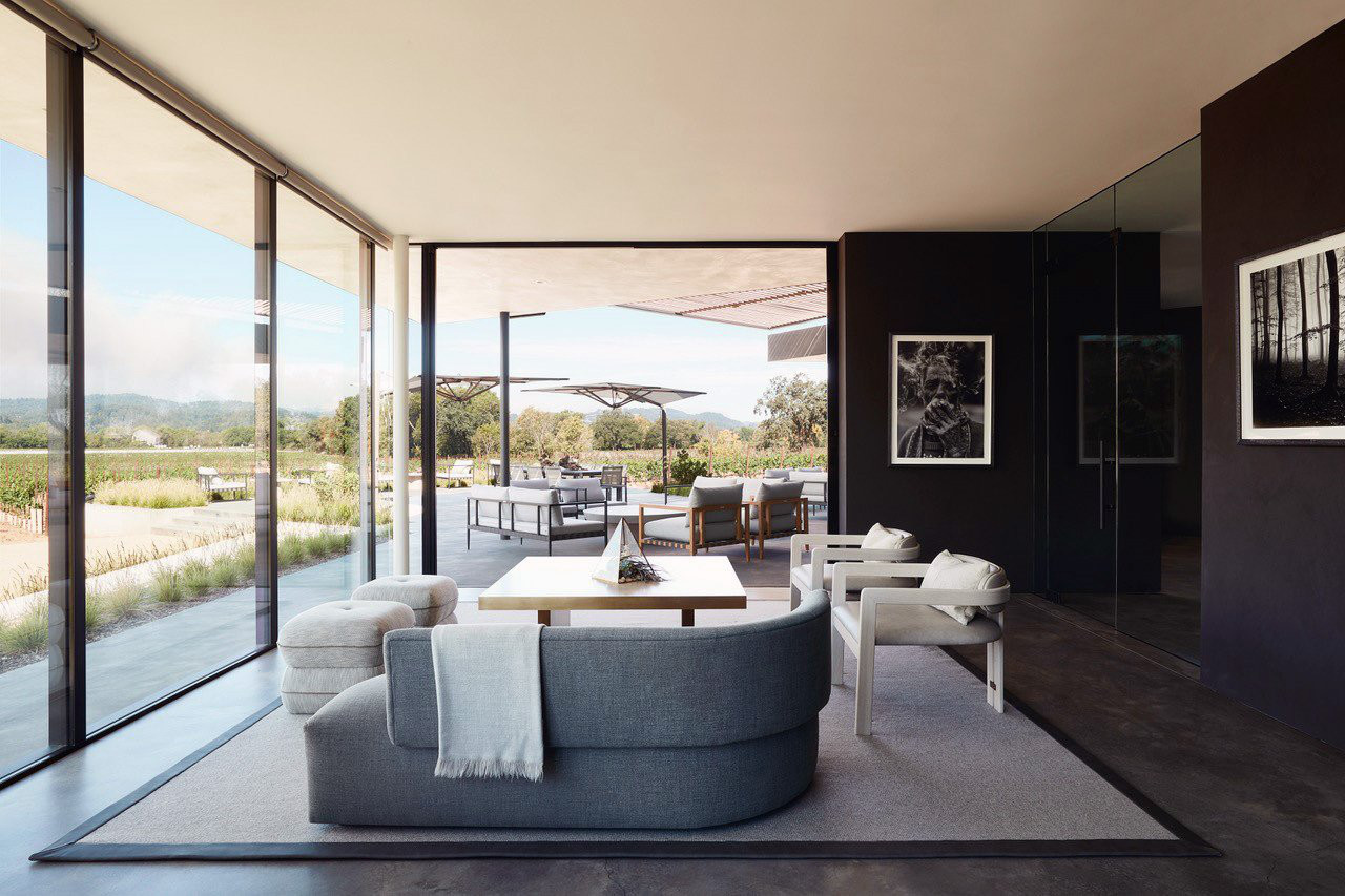 Glass walls form intimate tasting rooms, and each provides a panoramic vineyard view so visitors can truly appreciate not only the wine but also its origin. Shades were necessary to manage glare and heat gain, but they needed to be subtle so as not to disrupt sightlines.