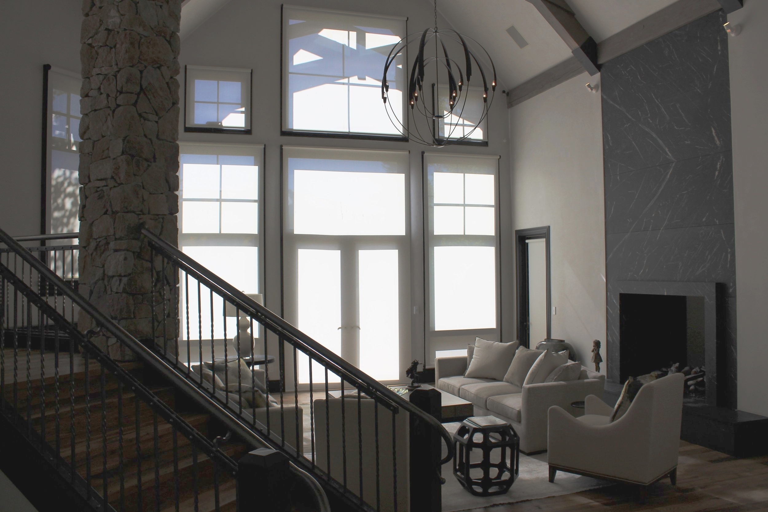 This shading system was installed post-remodel to replace a poor performing system. Since the home was newly painted and fully decorated prior to installation, new wiring was not an option, and the homeowner opted for battery powered window shades. J Geiger battery motors are rechargeable and can last over a year on a single charge. Better still, batteries remain in the shade tube while charging so there is no need to remove them from the system. Best of all, the homeowner can reveal this spectacular view time and time again with the touch of a button.