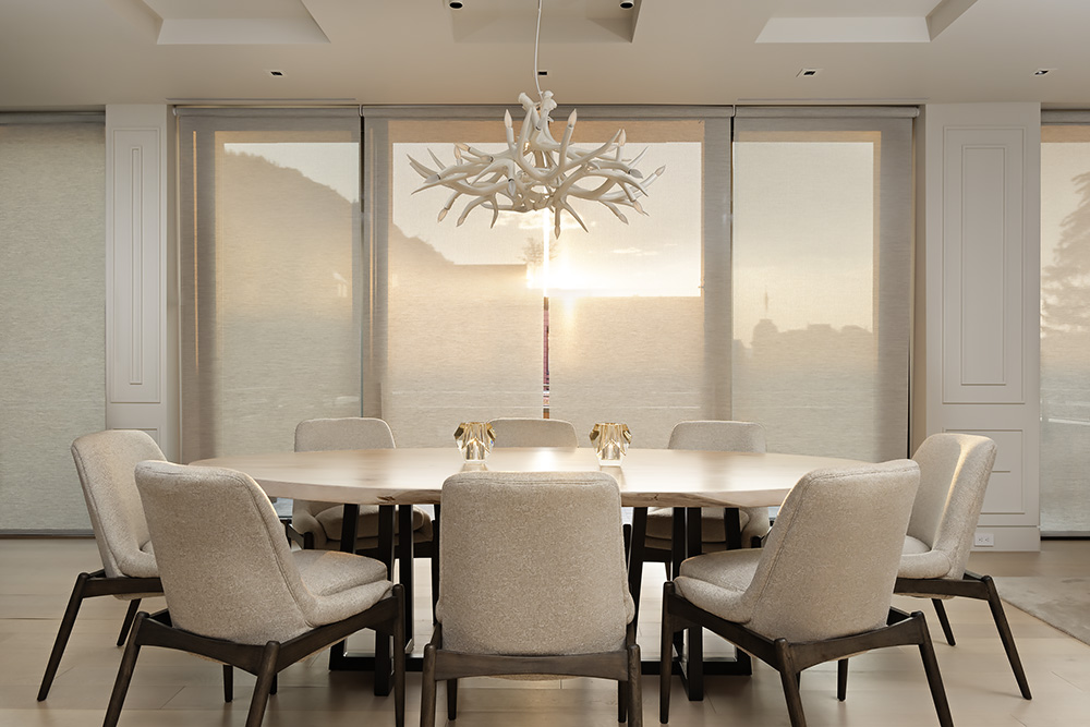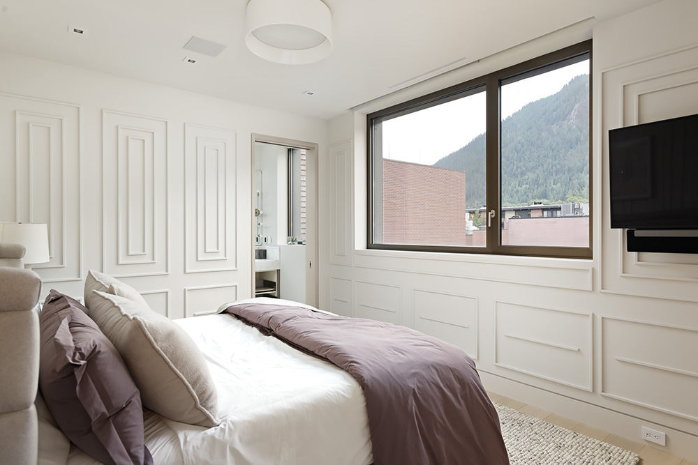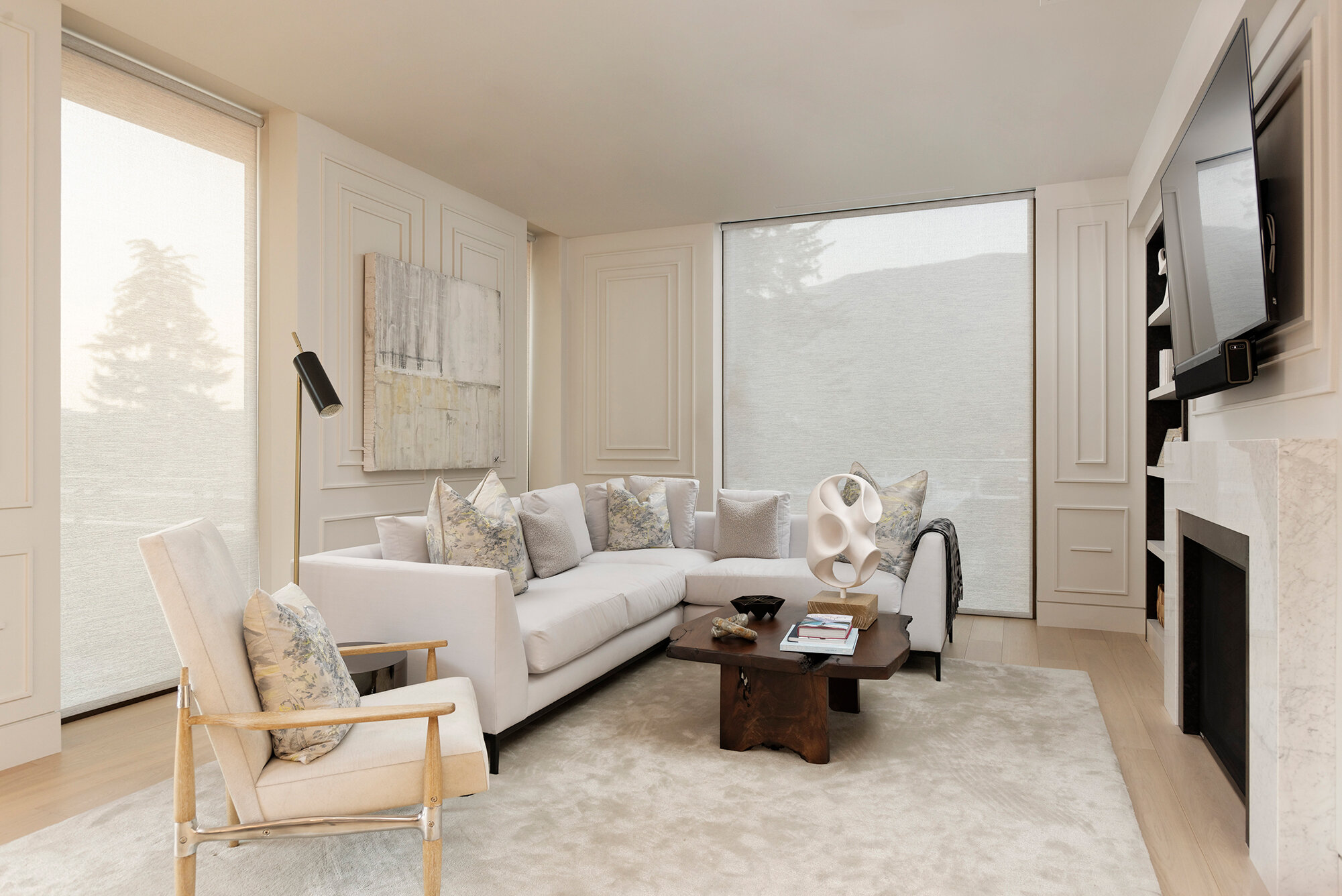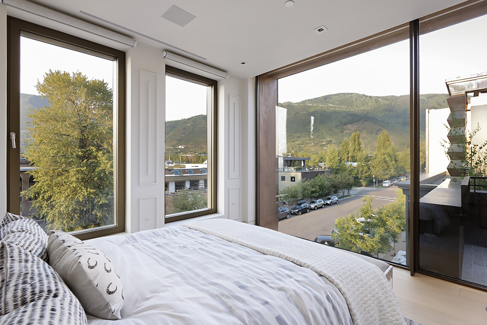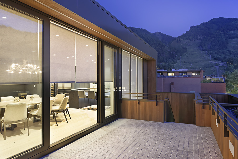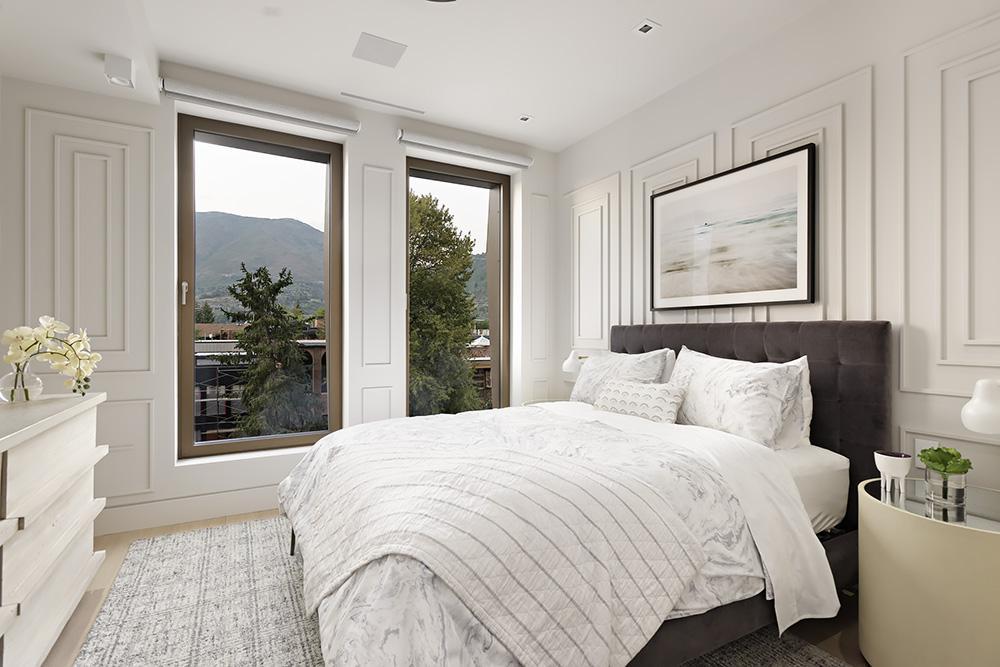 Floor-to-ceiling windows in the living room, kitchen, and master bedroom offer an abundance of natural light, but privacy was a concern given the street and sidewalk traffic below. Aspen Starwood’s design team opted for window shades by J Geiger to soften the space. A sheer shade fabric filters light without blocking the mountain view, and white mounting hardware virtually disappears amidst muted interior finishes.