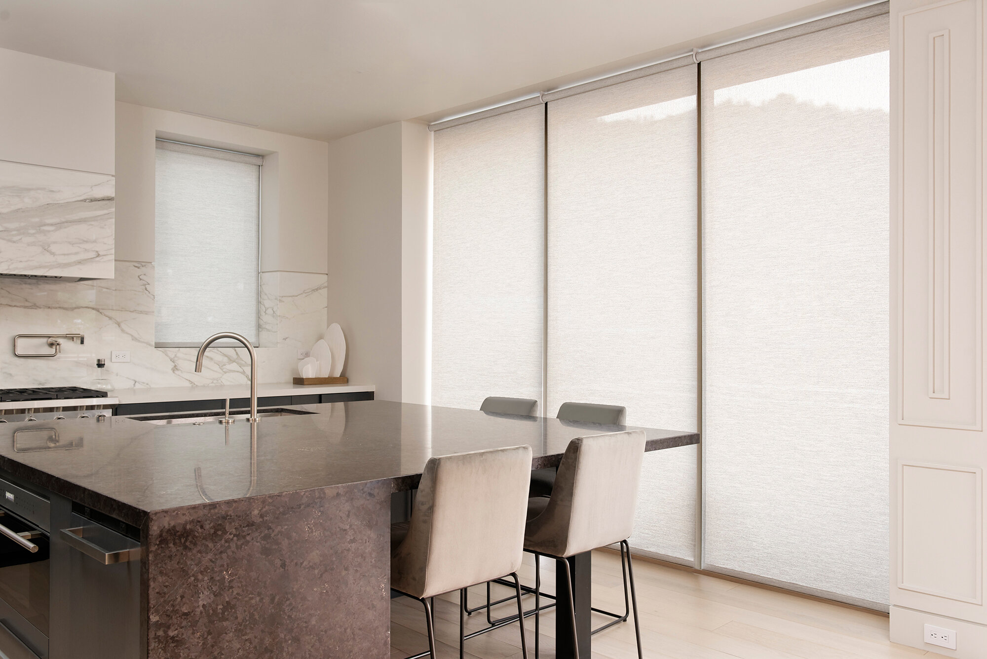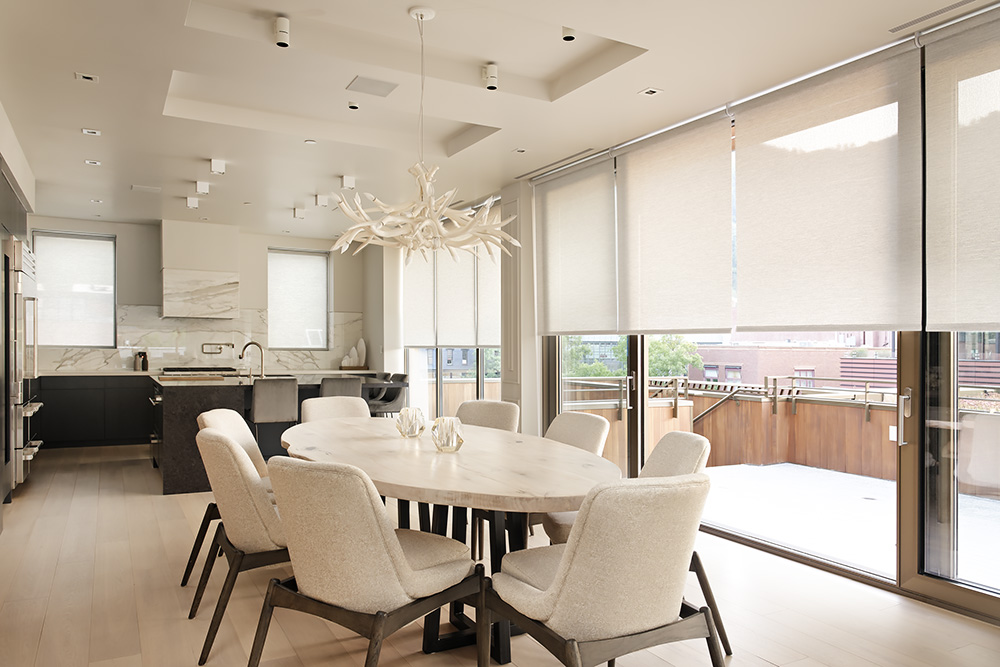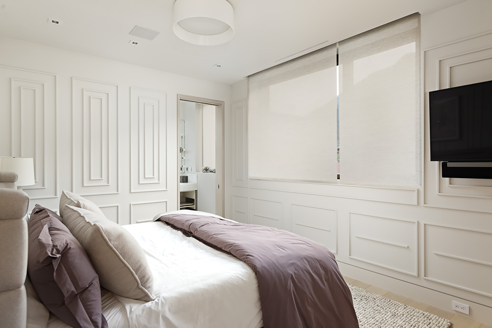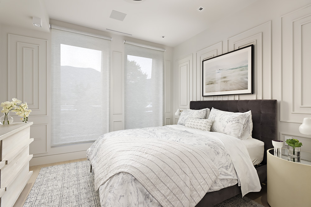 “We needed an elegant solution for the large floor to ceiling window bays. Being a penthouse unit in a commercial building, we wanted to soften the look of the bedrooms… The exposed rollers with sheer, grey fabric really shine.”